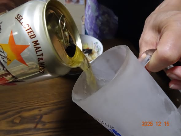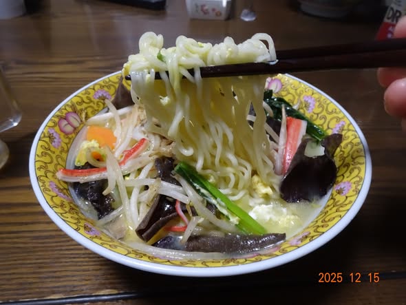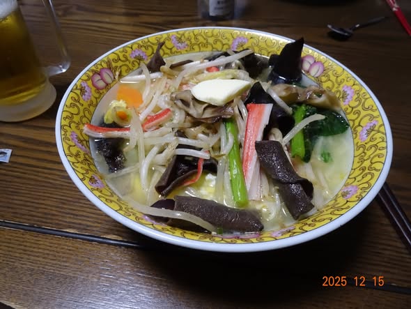 | 18時前 KAMIさんが用意しました 具沢山のサッポロ一番塩ラーメン 肉っけなしです 微アル0.7 |
