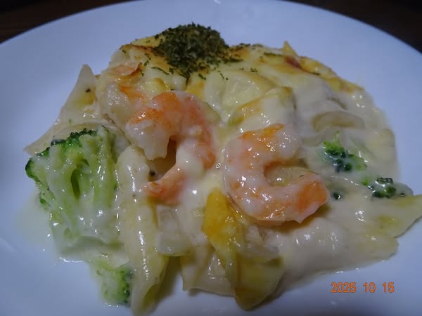 玉葱 海老 帆立 ブロッコリー ホワイトソースも自前です |