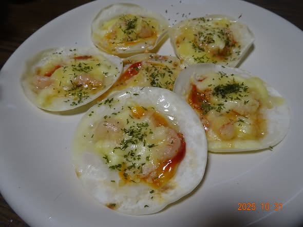 | ・餃子の皮に ケチャップ マヨをぬり 甘えびの塩辛 |