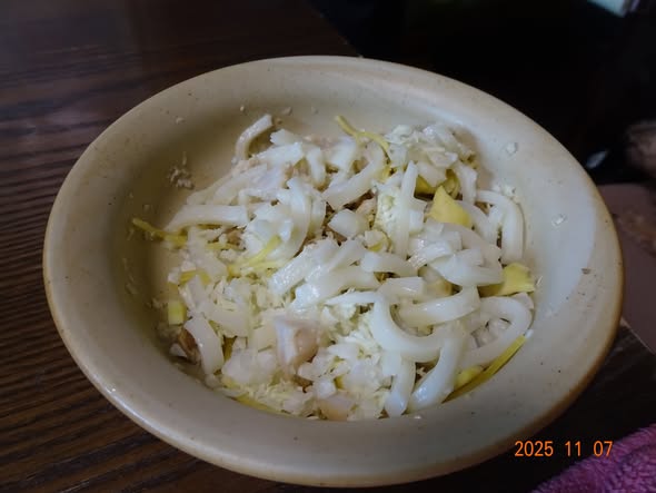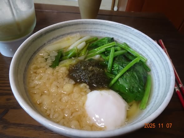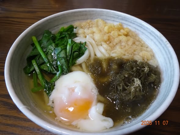 | うどん ほうれん草 温玉 天かす とろろ昆布 |