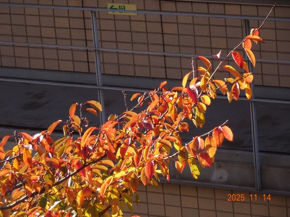 | 階下の桜の樹の葉っぱが真っ赤 あとは枯れて散るのみ |
