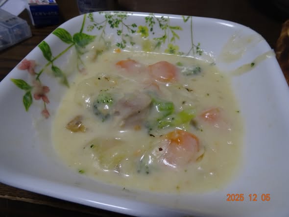 | ・ホワイトシチュー じゃが芋 玉葱 人参 鶏肉 ブロッコリー |