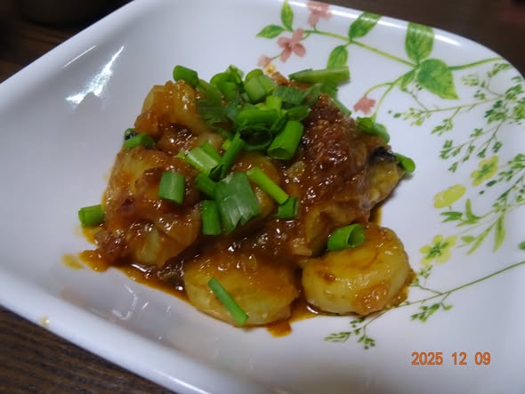 | 焼こうか 煮ようか 煮魚にしました 水飴がミソです |