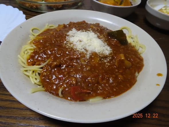 | ・ミートソース 市販のルーに玉葱 トマト 舞茸 ケチャップ 牡蠣油 |