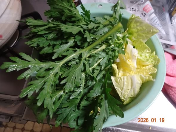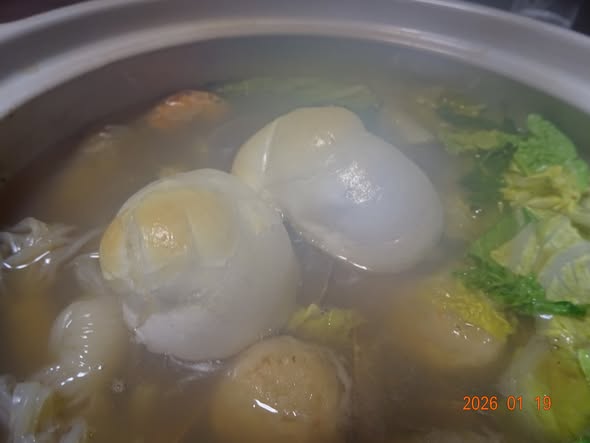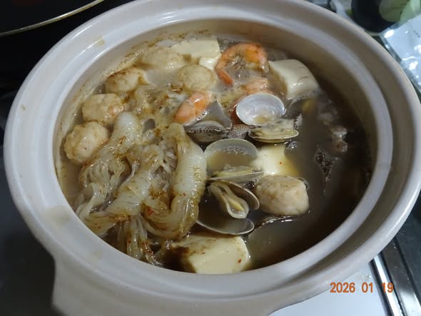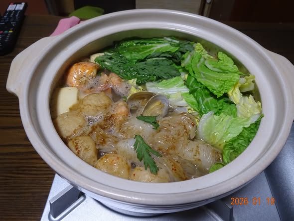 海鮮鍋  海老 鶏団子 大粒アサリ 白菜 春菊 糸コン