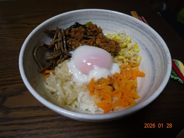 | 人参 大根 ゼンマイ ほうれん草 ひき肉 温玉 |
