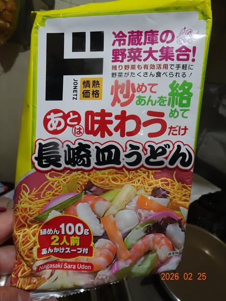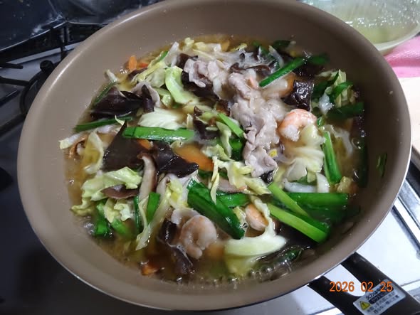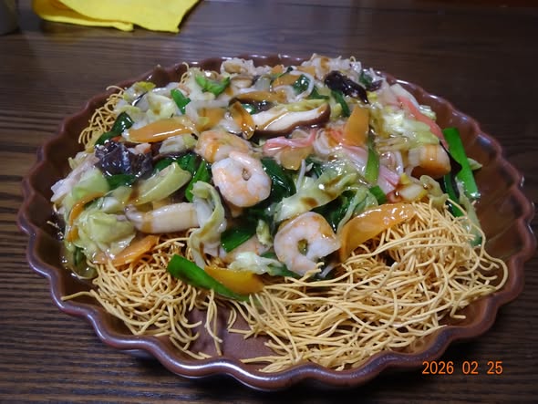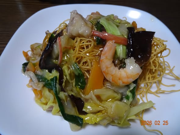 | 皿うどん 豚肉 海老 カニカマ 白菜 キャベツ 人参 椎茸 木耳 韮 |