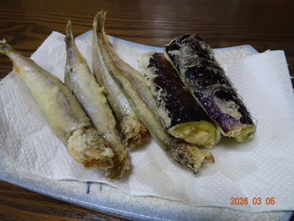 | ・シシャモと茄子の素揚げ 鶏唐揚げのついで |