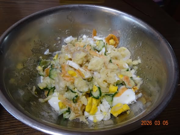 | ・ポテサラ ポテト キュウリ 人参 らっきょう 竹輪 ゆで卵 |