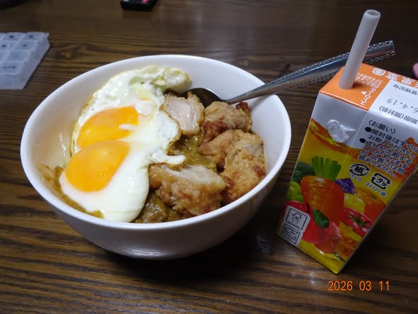 | 残飯整理 残り物のカレー から揚げでカレー丼 目玉焼きのせ |