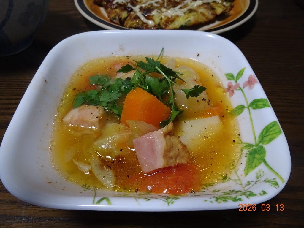 | ・ポトフ 玉葱 じゃが芋 人参 キャベツ ベーコン トマト |
