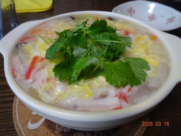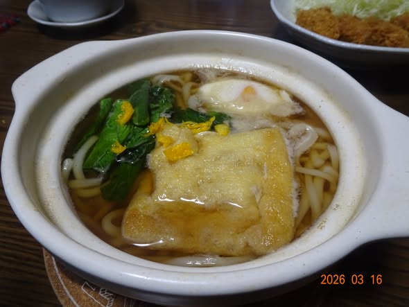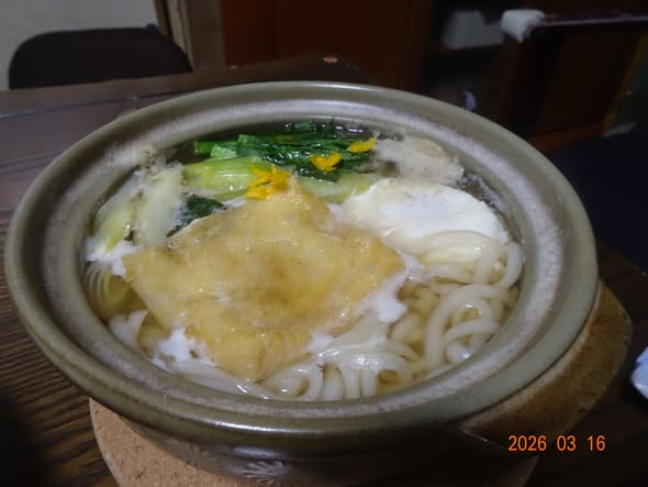 | ・鍋焼きうどん 油揚げ 餅を入れました 菜の花 葱 卵 |