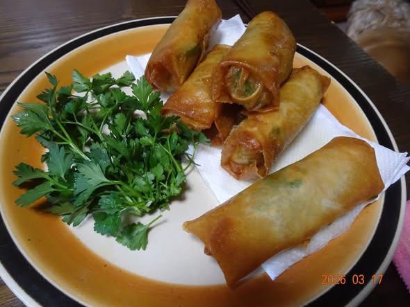 | ・揚げ春巻き 豚肉 もやし ピーマン春雨 パクチー |