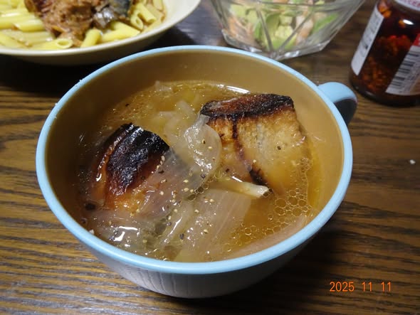 | ・オニオングラタンスープ 玉葱はレンチンして飴色まで炒めました |