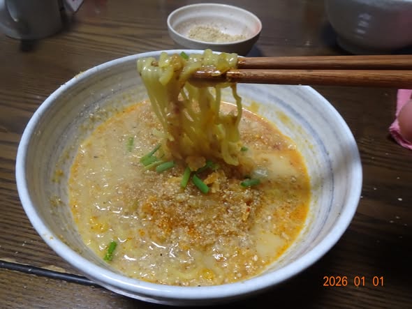 | トッピングは玉葱二個に ピーナツ粉 食べるラー油 白胡麻 |
